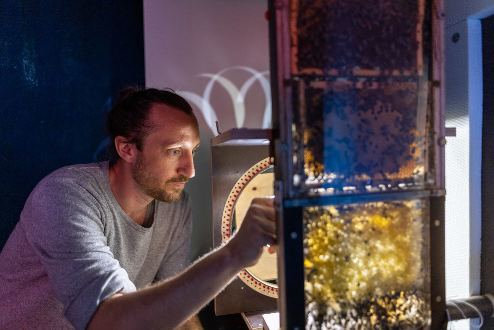 Dr. Paul Siefert bei Langzeitvideoaufnahmen von Beobachtungsvölkern am Institut für Bienenkunde in Oberursel. @ Jan Bosch